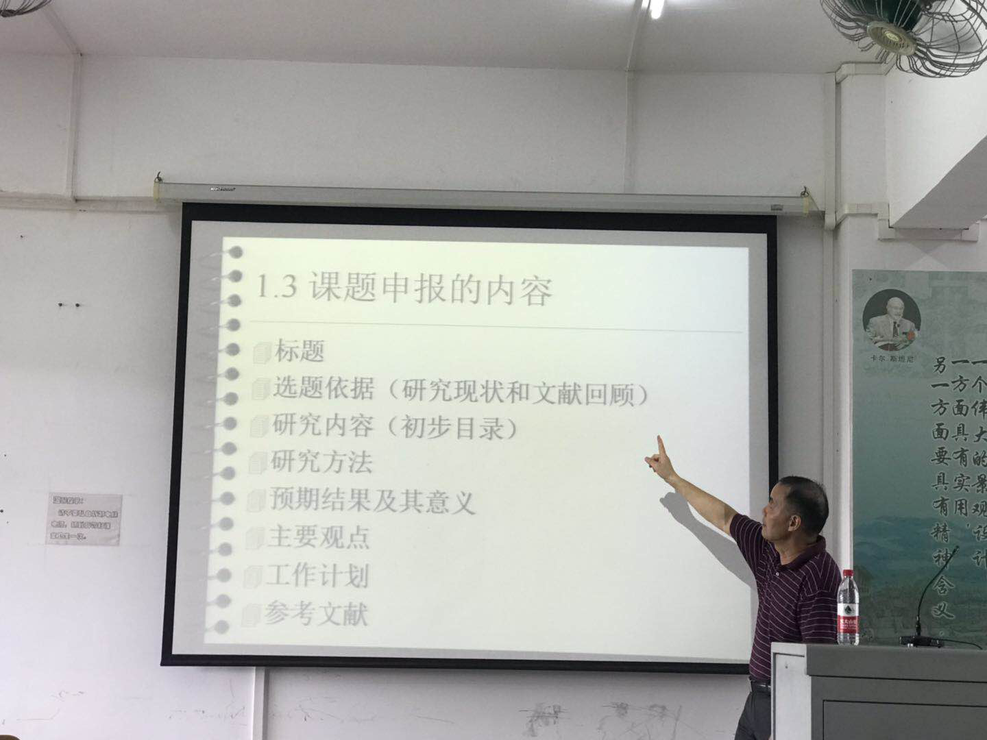 佘立中教授以精深的专业知识和丰富的科研申报经验,紧紧围绕科研项目申报注意事项的主题,从课题申报概述、课题申报注意事项、广东省哲学社会科学“十三五”规划项目申请书简介、优秀教学成果奖申报等四个主要方面进行《课题申报与分析》的专题学术讲座。同时,他结合自身经验向与会人员传授了五点经验:一是逐项填写;二是注重创新;三是注重团队结构,人员搭配合理;四是做好不易立项的思想准备;五是做好科研积累和科研的申报准备工作。