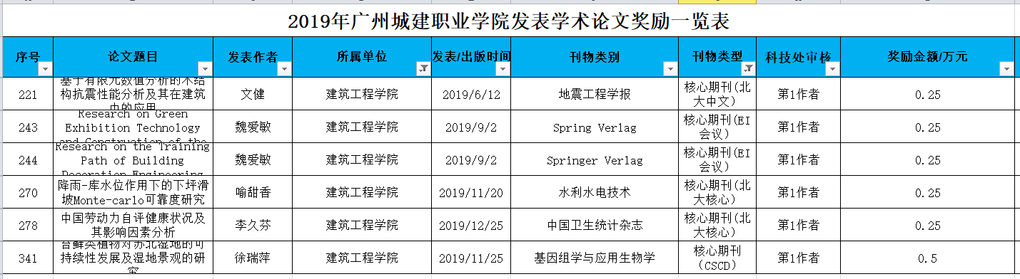 学术论文方面,我院发表的论文总数为98篇,占全校380篇论文的25.8%,其中北大核心期刊以上论文有6篇,分别为魏爱敏副院长的《Research on Green Exhibition Technology and Construction of the Application Evaluation》、《Research on the Training Path of Building Decoration Engineering Technology Professionals》;文健老师的《基于有限元数值分析的木结构抗震性能分析及其在建筑中的应用》、喻甜香老师的《降雨-库水位作用下的下坪滑坡Monte-carlo可靠度研究》、李久芬老师的《中国劳动力自评健康状况及其影响因素分析》、徐瑞萍老师的《苔藓类植物对苏北湿地的可持续性发展及湿地景观的研究》,占全校北大核心期刊以上论文的20.7%。