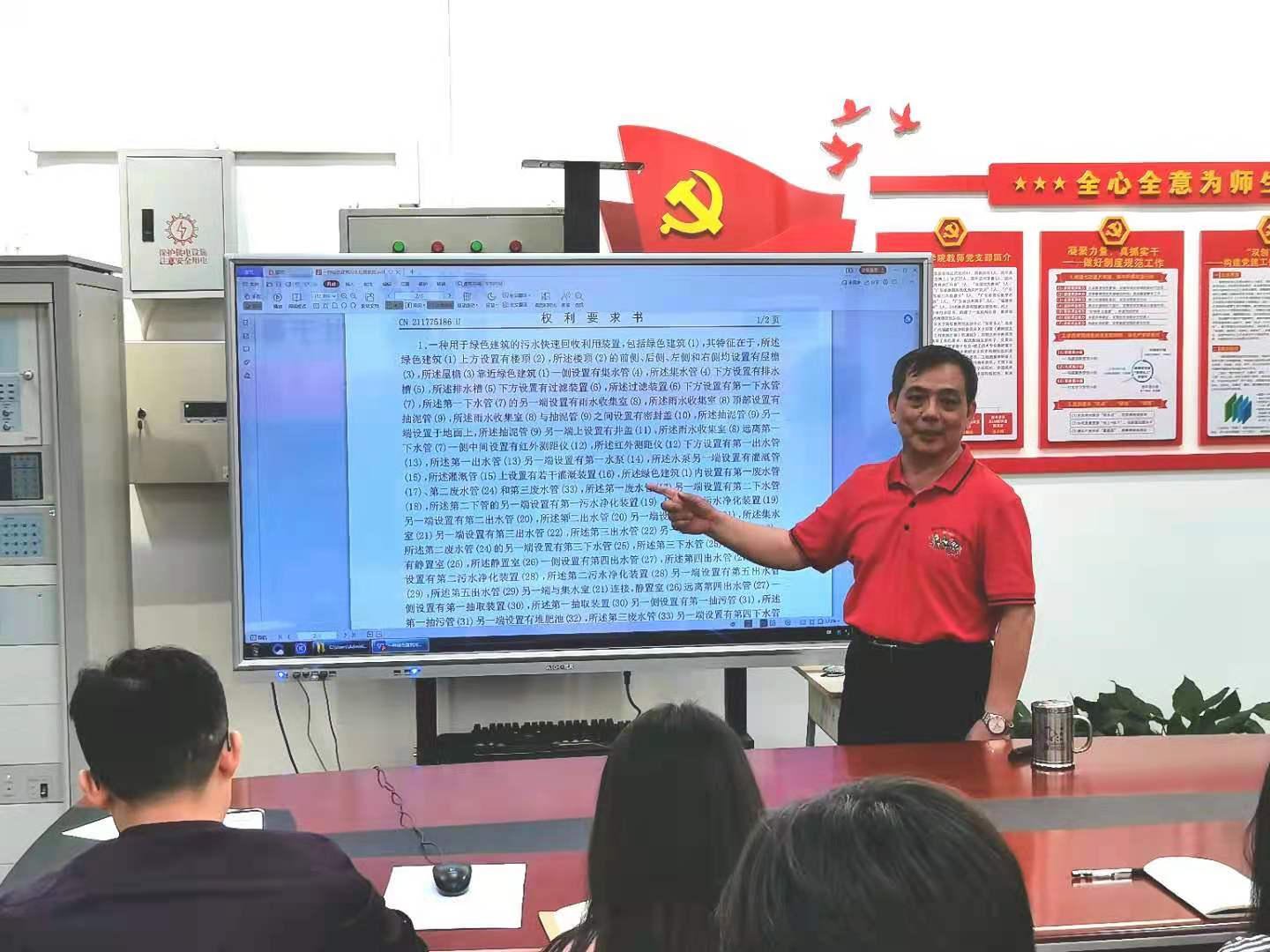 劳教授用了10多张八角重檐攒尖亭安装施工照片,向师生们详细介绍了他 “亭顶戗脊弧度安装定位装置”国家发明专利研发的方法,还把他委托专利代理公司代为向国家知识产权局递交的国家发明专利申请文本,向师生作了详细的解说。提出要了解并指出现有亭顶戗脊弧度安装定位装置的技术问题及存在的缺陷,本发明所要解决其技术问题及存在缺陷,提供创新的亭顶戗脊弧度安装定位装置,这是研发国家发明专利的重点。劳教授还强调写好权力要求书的重要性,并分享了他申请国家发明专利获得成功的有益经验。紧接着听取了学生代表10多个专利研发项目的初步设想及方案,劳教授对这些设想及方案给予了充分肯定,对专利研发下一步工作给予了提示和引导。劳教授鼓励师生们要深入研究和开发具有创新性、新颖性、实用性的技术和产品,并问师生有没有信心申请并获得国家发明专利授权,“有”,师生们响亮回答得到劳教授的肯定。师生们表示期待劳教授下一期国家专利研发的系列讲座。