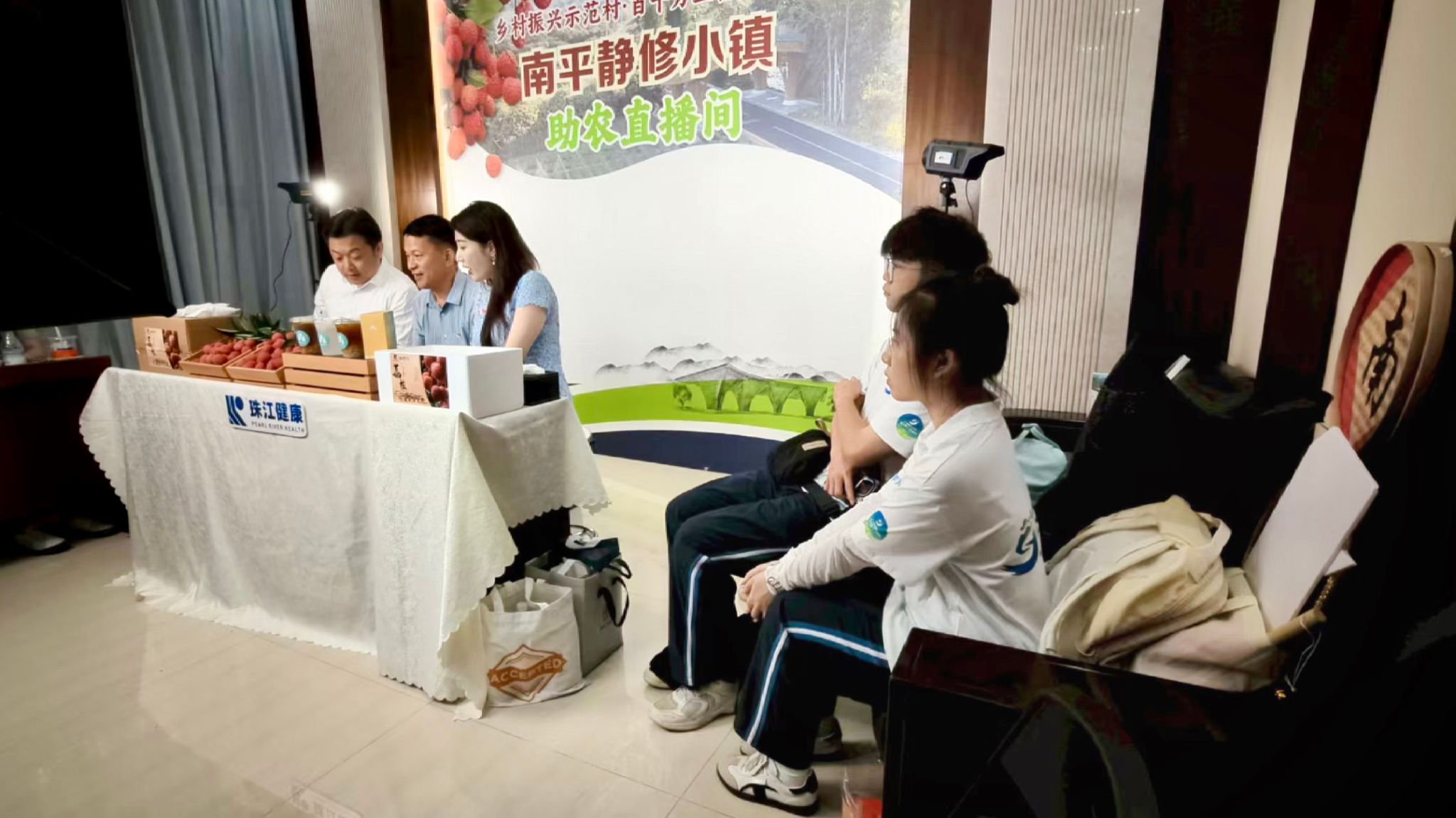 实践队首站走进温泉镇人民政府,工作人员为实践队详细讲解了南平静修小镇的生态优势、文旅特色与振兴成果,特别提到“电商助农让荔枝走出大山”的实践。队员们实地探访了助农直播间,这里的镜头连接着城乡市场的供需桥梁,藏着对“科技+农业”的新模式。
