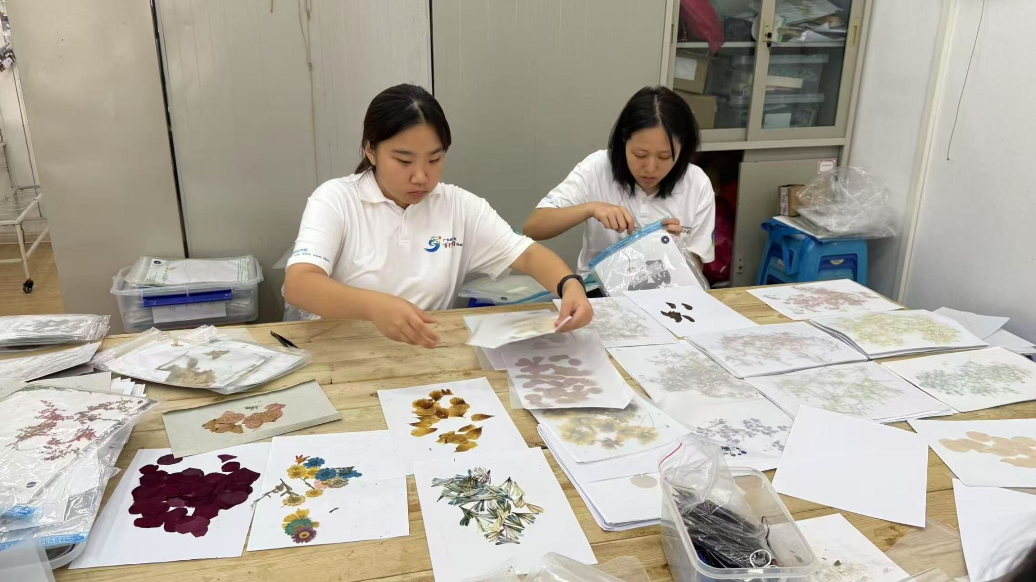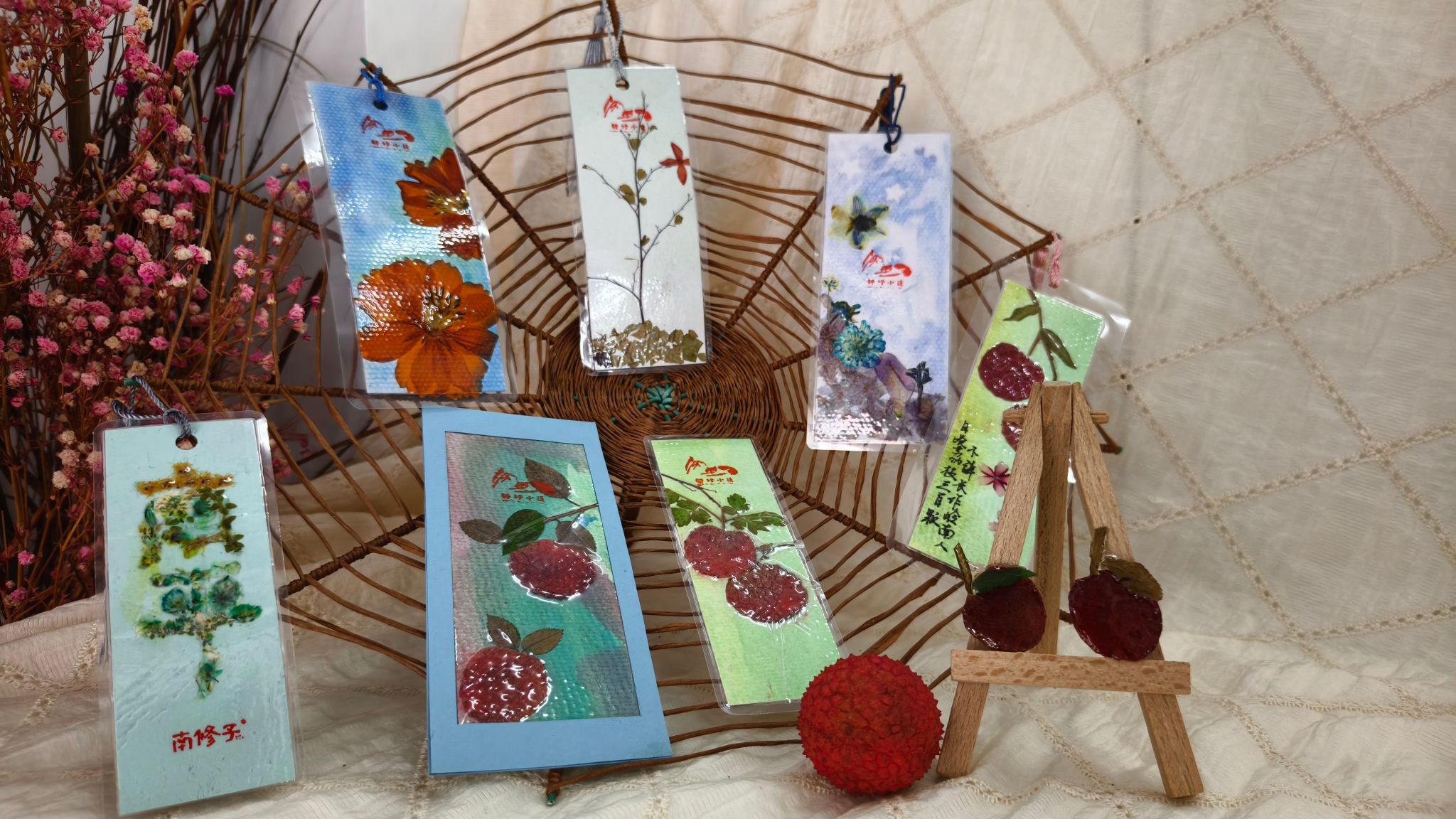 针对文创设计需求,学子们入田间、访古建,与村民唠家常,梳理出“静修文化”等特色脉络。运用园林压花技艺,掉落的荔枝叶、野花等被精心筛选和干燥,化作书签、滴胶摆件的艺术符号,形成了带着南平印记的文创IP形象、书签与衍生品等。这些文创产品将如同“移动名片”以直观、形象的方式向外界展示南平村的独特魅力。