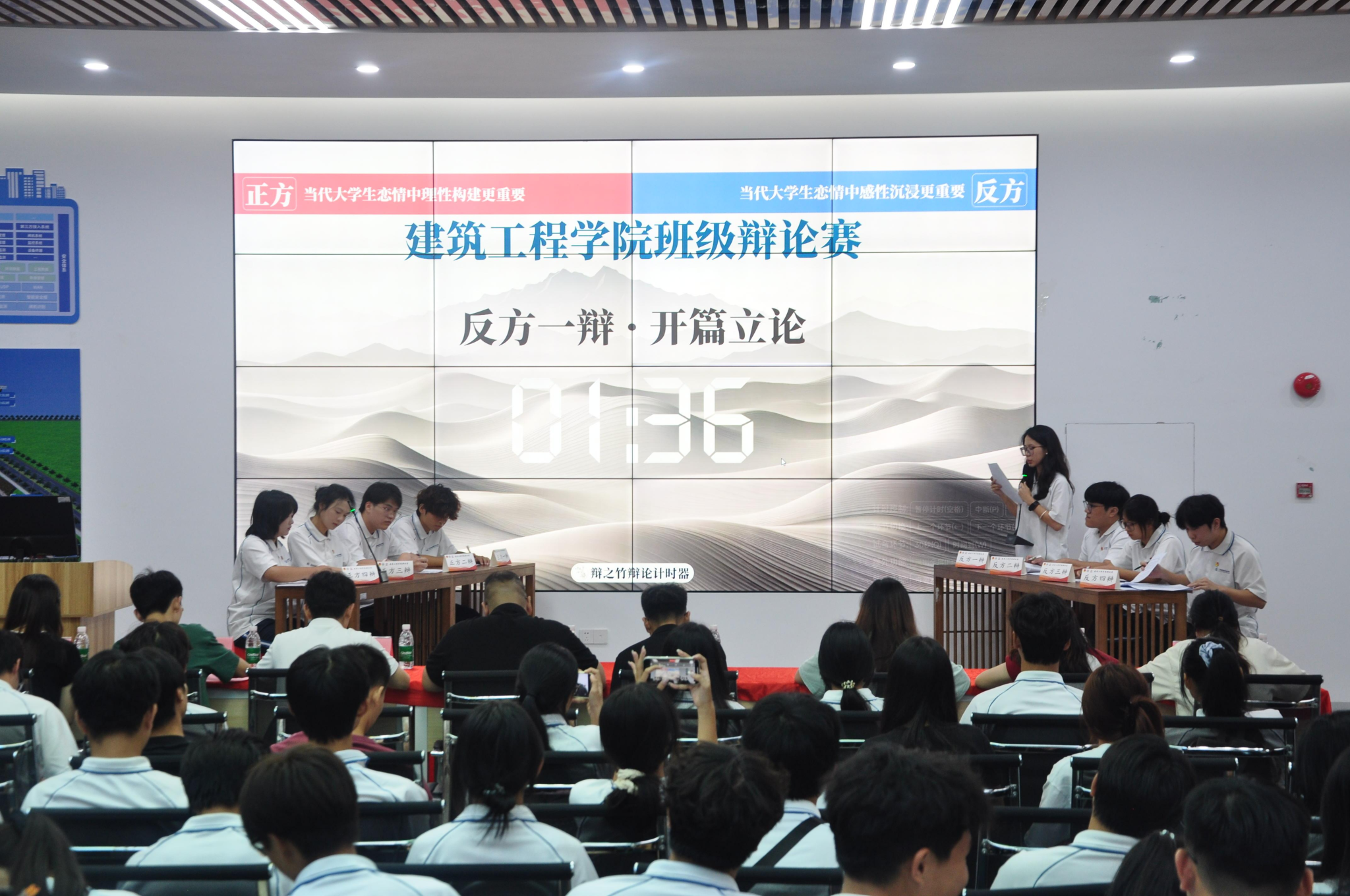 开幕式上,学院团委文体发展中心辩论队围绕《在大学恋情中,“理性构建”与“感性沉浸”谁更重要》这一辩题进行展开辩论。参赛选手们思维缜密、论据充分,从大学生恋爱成长发展角度深入剖析理性与感性关系。现场学术氛围浓厚,观众反响热烈。评委组严格遵循评审标准,对双方辩手表现进行点评。彭聪在总结讲话中指出,大学生应当在感性与理性之间寻求辩证统一,既保持情感温度,也锤炼理性高度。他强调,建筑文化艺术节是学院重要育人平台,更是丰富校园文化,提供施展才华的舞台,学院要充分发挥辩论赛等品牌活动的育人功能,促进学生全面发展。同时,他引导全体新生班级要积极参与建筑文化艺术节及校园文体艺术季各类获得中,展现出建工学子的青春风采和专业素养,以更加饱满的热情和更加昂扬的斗志投入到学业中,为个人成长与学院发展增添亮色。
