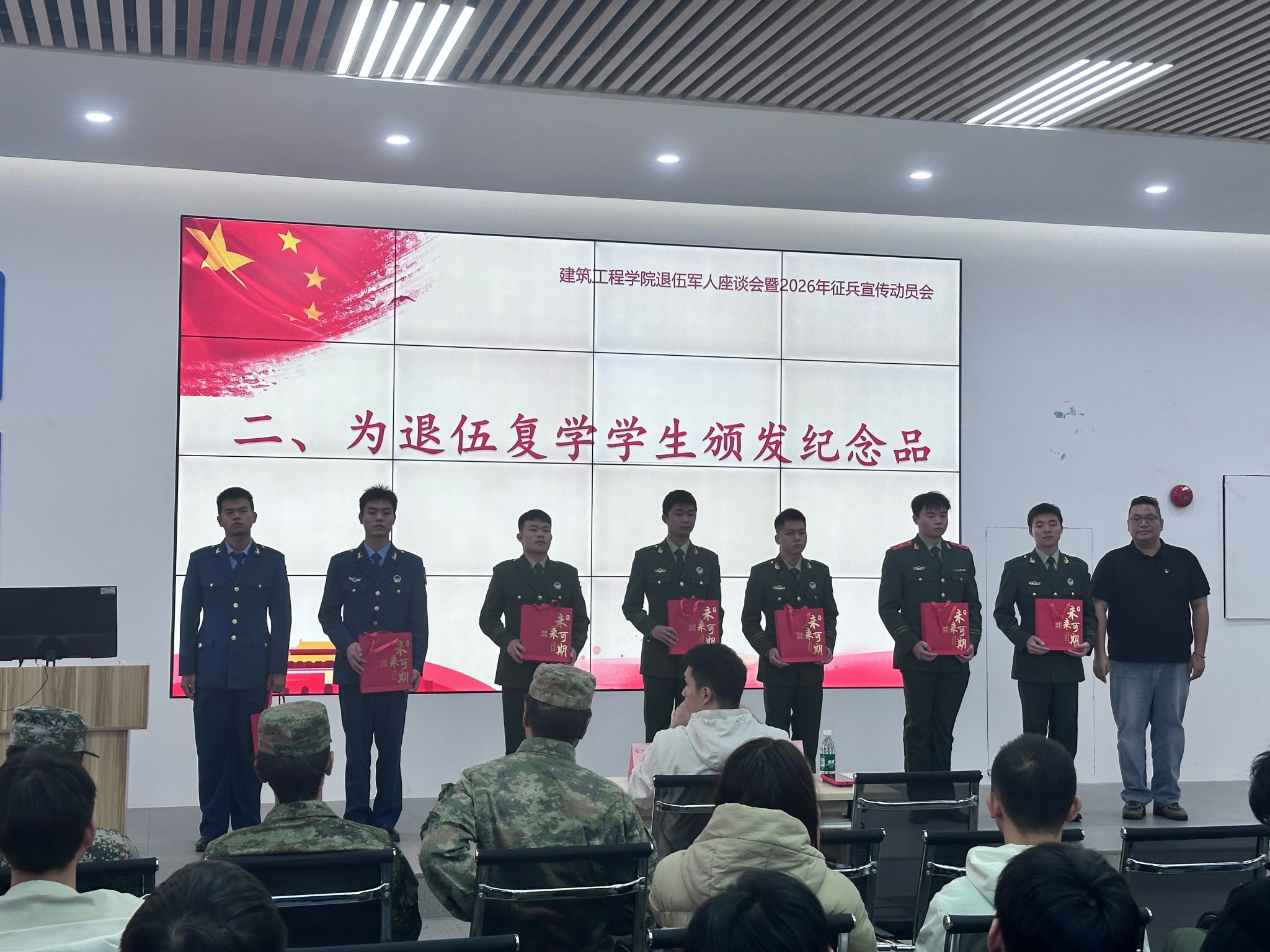 为进一步厚植大学生爱国主义情怀、强化国防意识,积极响应国家征兵工作部署,并关切退役学生返校后的学习与生活,2025年11月20日上午10:30,太阳集团网址8722学工办在建工机电楼B栋204G课室大厅召开退伍军人座谈会暨2026年征兵宣传动员会。学院党委副书记、副院长彭聪,征兵专员胡国兴,2025年秋季退役复学学生、2025级新生军训教官及2023级学生代表共70余人参加本次活动。