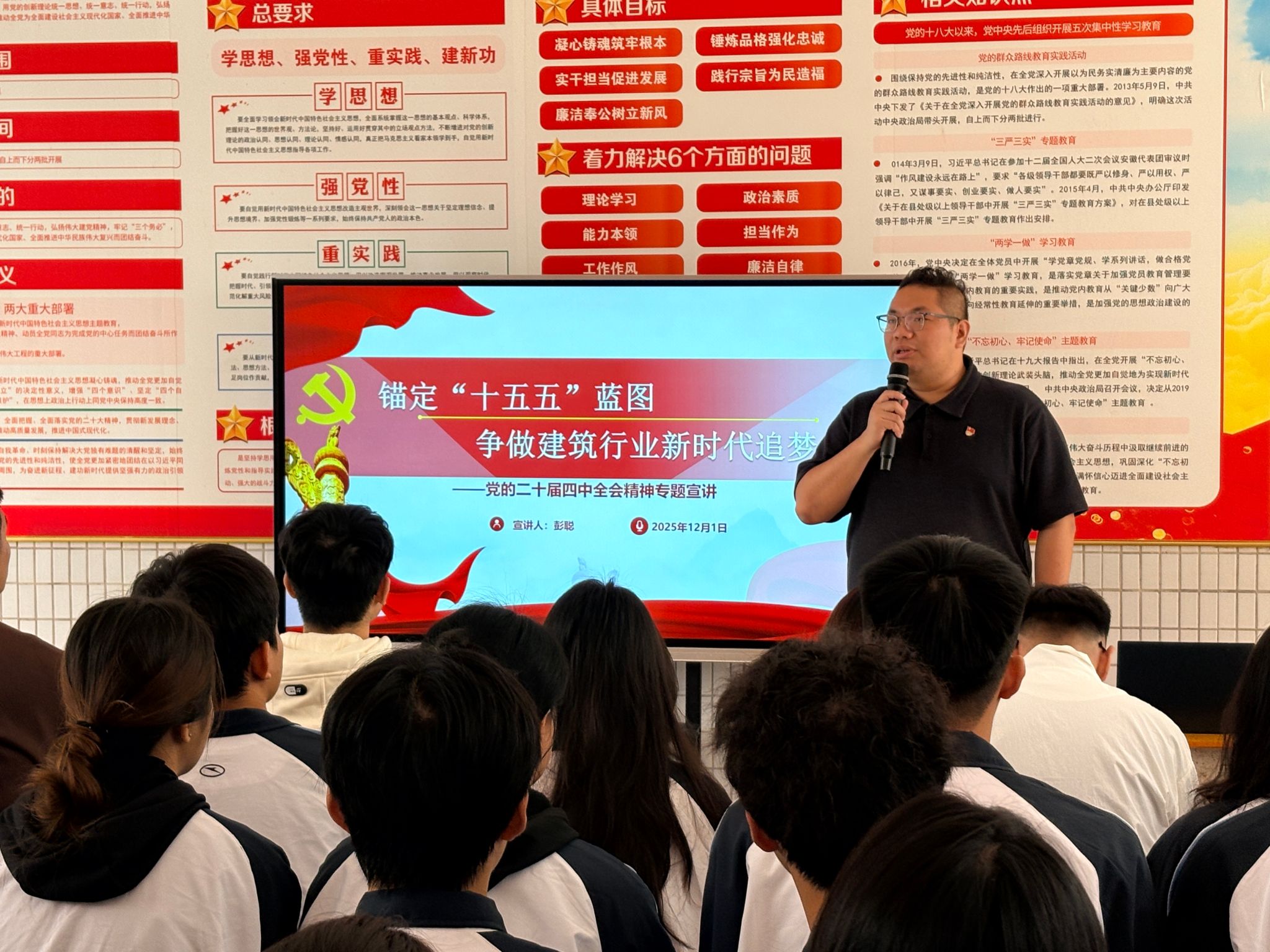 宣讲会上,彭聪以“锚定‘十五五’蓝图,争做建筑行业新时代追梦人”为主题,从全会审议通过的“十五五”规划建议核心要义切入,系统解读了“高质量发展”“新质生产力”“美丽中国建设”等关键部署。结合建筑行业发展趋势,他重点阐释了全会精神对建筑教育的实践要求,鼓励同学们将个人专业所长与国家战略需求紧密结合,在智能建造、绿色建筑、城乡融合发展等领域深耕细作,把青春理想融入中国式现代化建设大局。方晓东以“征程万里风正劲,重任千钧再扬帆”为题,从基层党组织建设和青年使命担当出发,通过鲜活案例解读了全会提出的“坚持党的全面领导”“促进人口高质量发展”等重要原则。他结合学生社区日常管理与党支部工作实际,号召同学们在社区生活中践行社会主义核心价值观,积极参与志愿服务、社区共建等实践活动,以实际行动落实全会精神,在集体中锤炼品格、增长才干。师生们纷纷表示,此次宣讲将宏大理论与专业特色、社区生活相结合,内容接地气、有温度,让人深受启发。