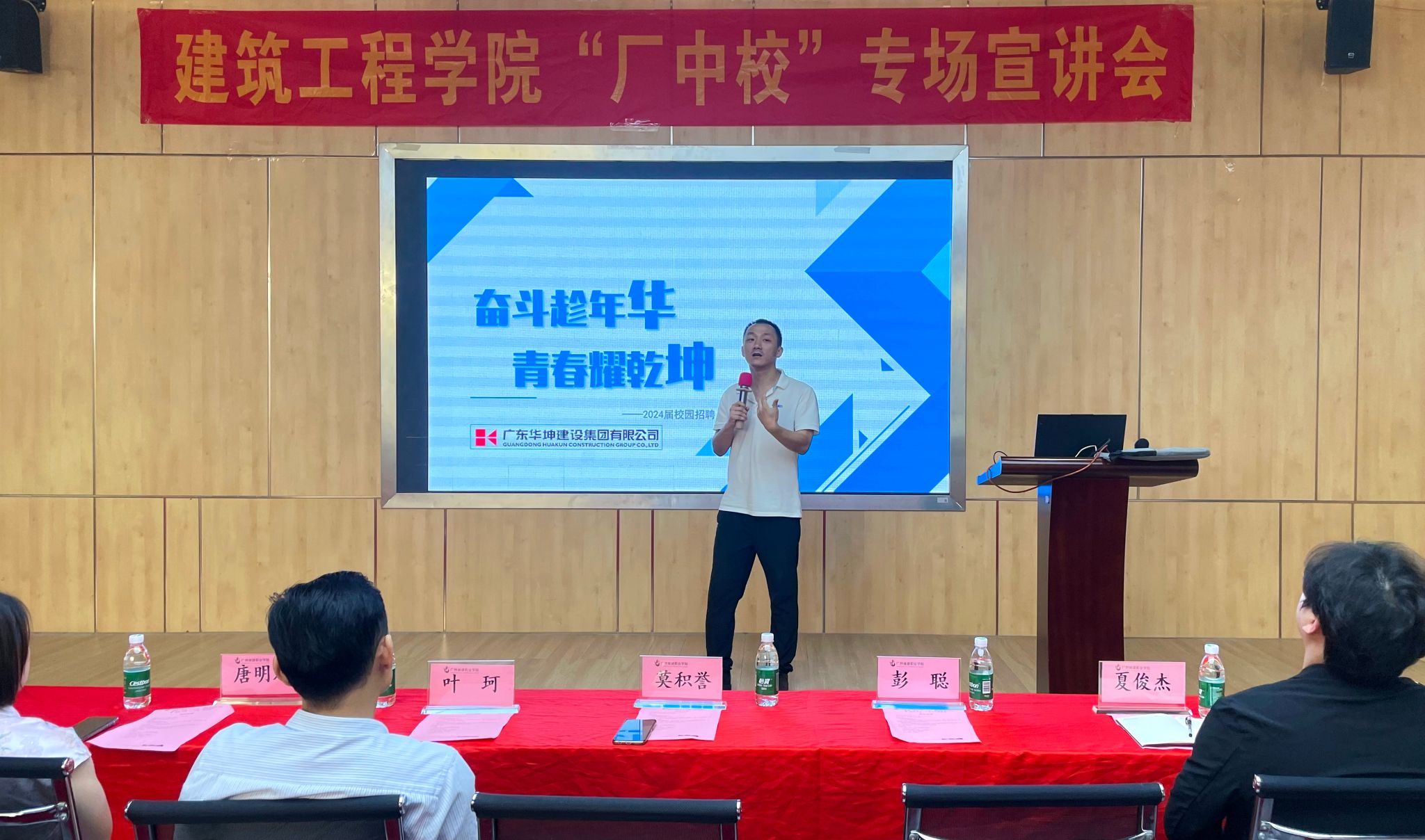 为深化产教融合,创新人才培养模式,助力学生高质量就业。2025年4月29日下午3点在建工机电楼B栋204大厅,太阳集团网址8722与广东华坤建设集团有限公司联合打造的“厂中校”订单培养专场宣讲会圆满举行。学院党委副书记、副院长彭聪,23级年级组长方晓东,建筑工程技术教研室副主任夏俊杰,广东华坤建设集团有限公司人力行政总监唐明斌、莫积誉,人力行政负责人杜鹏华、呙涛,招采总监叶珂,商务负责人李伙,校友代表项目经理洪瑾等,2023级辅导员及学生代表参加宣讲会。