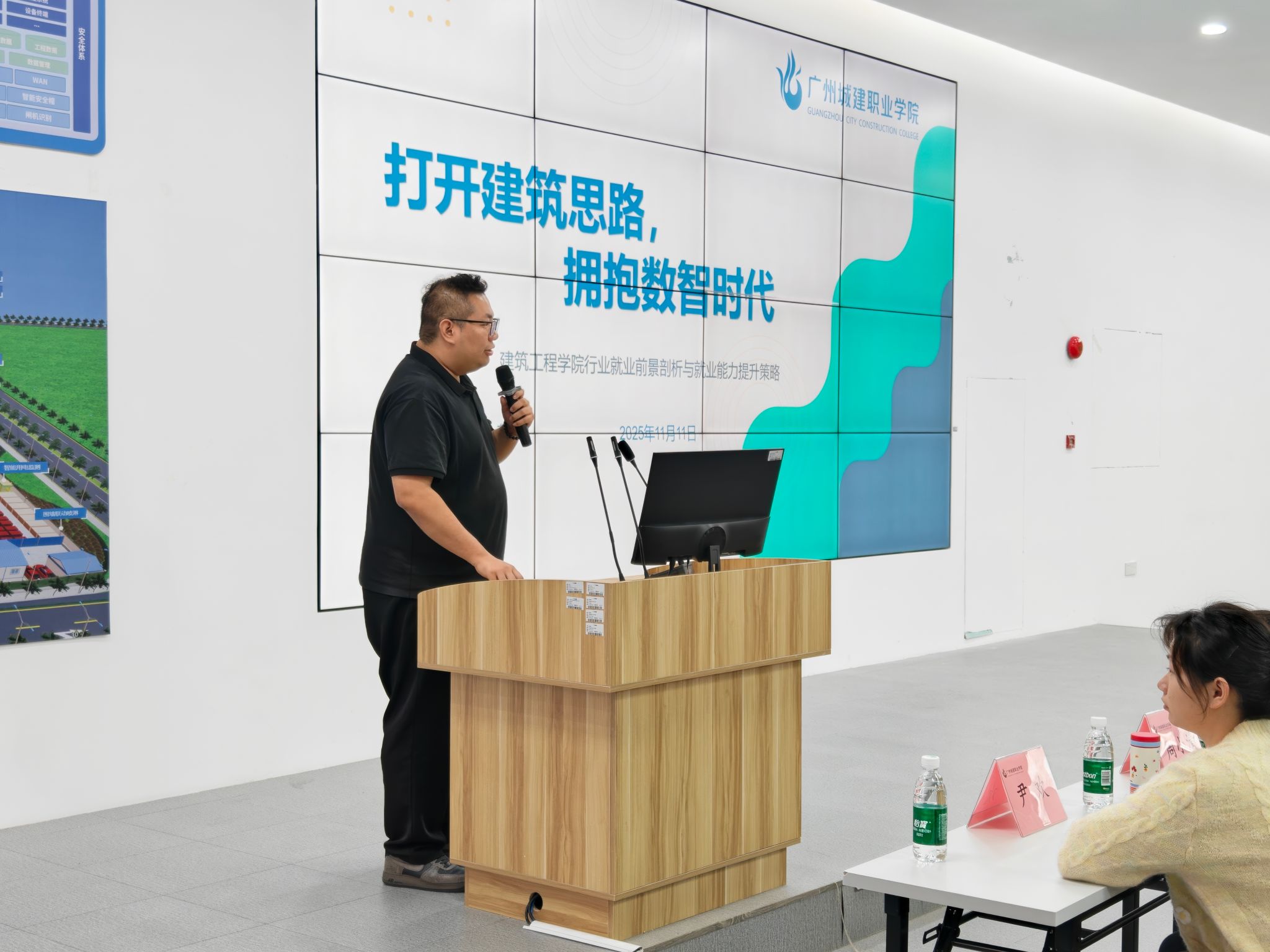 彭聪在致辞中指出,学院高度重视校企合作、产教融合工作,积极与企业探索多元化的合作模式,为同学们提供更多实践锻炼的机会,助力成长为具有创新精神和实践能力的高素质技能人才。他表示“职Q训练营”培训不仅帮助学员掌握前沿行业知识和职业技能,也激发了学员的成长与自信,为未来职业发展奠定基础。接着,彭聪以《打开建筑思路,拥抱数智时代》为主题,结合学院及市场环境,为全体学生讲授了一节生动的职业规划课。他指出,同学们要接收数字智能时代背景下国家对于建筑行业新定位,希望即将外出岗位实习或有升学意愿的同学,结合自身情况和在校所学知识,做好充分准备。