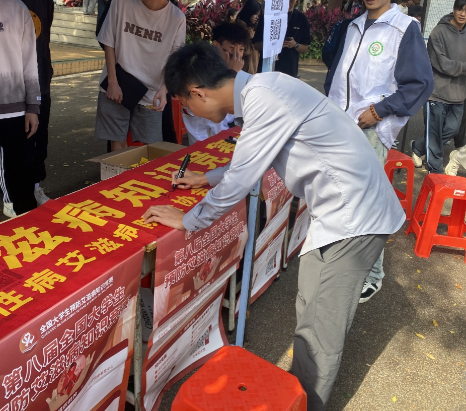 活动过程中,资助服务站通过现场摆摊,动员同学线上答题,派发防艾物资等方式向同学普及预防艾滋病的相关知识。现场同学热情高涨并在宣传横幅上签名,活动达到了预期的宣传效果。