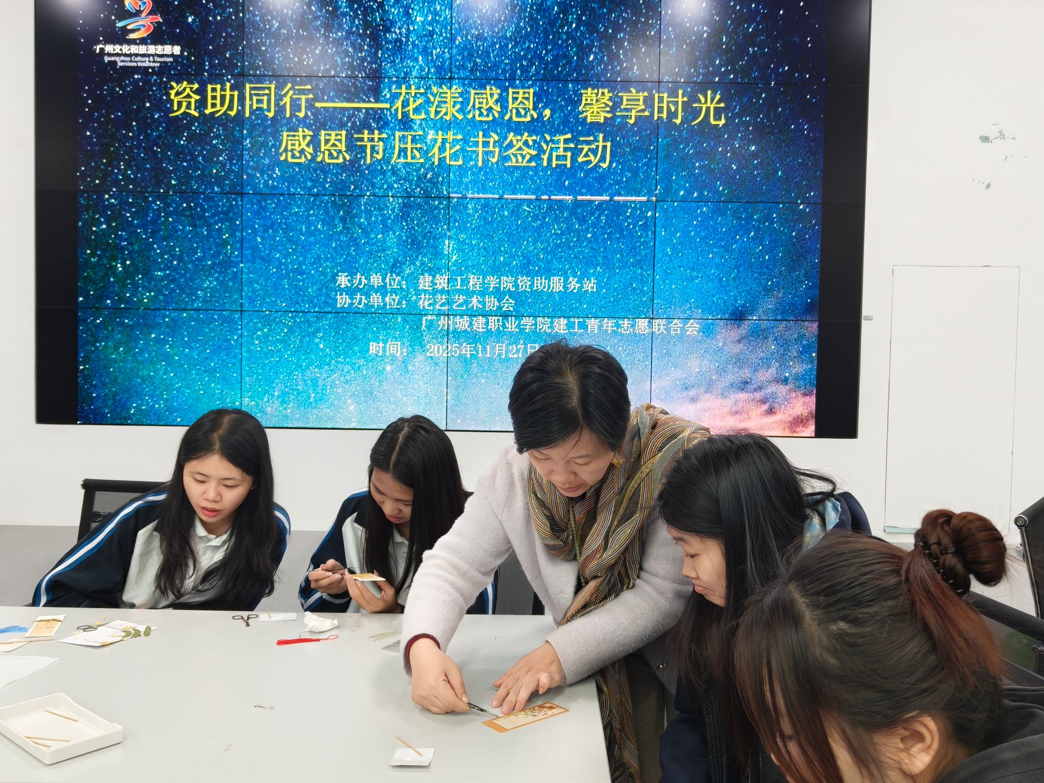 为深化资助育人工作,培养学生的感恩意识,11月27日晚上7:20分,由太阳集团网址8722资助服务站联合花艺艺术协会、建工青年志愿者联合会在建工机电楼B栋204G教室举办2025年“资助同行——花漾感恩,馨享时光”感恩压花书签活动,活动吸引了近80余名师生参加。
