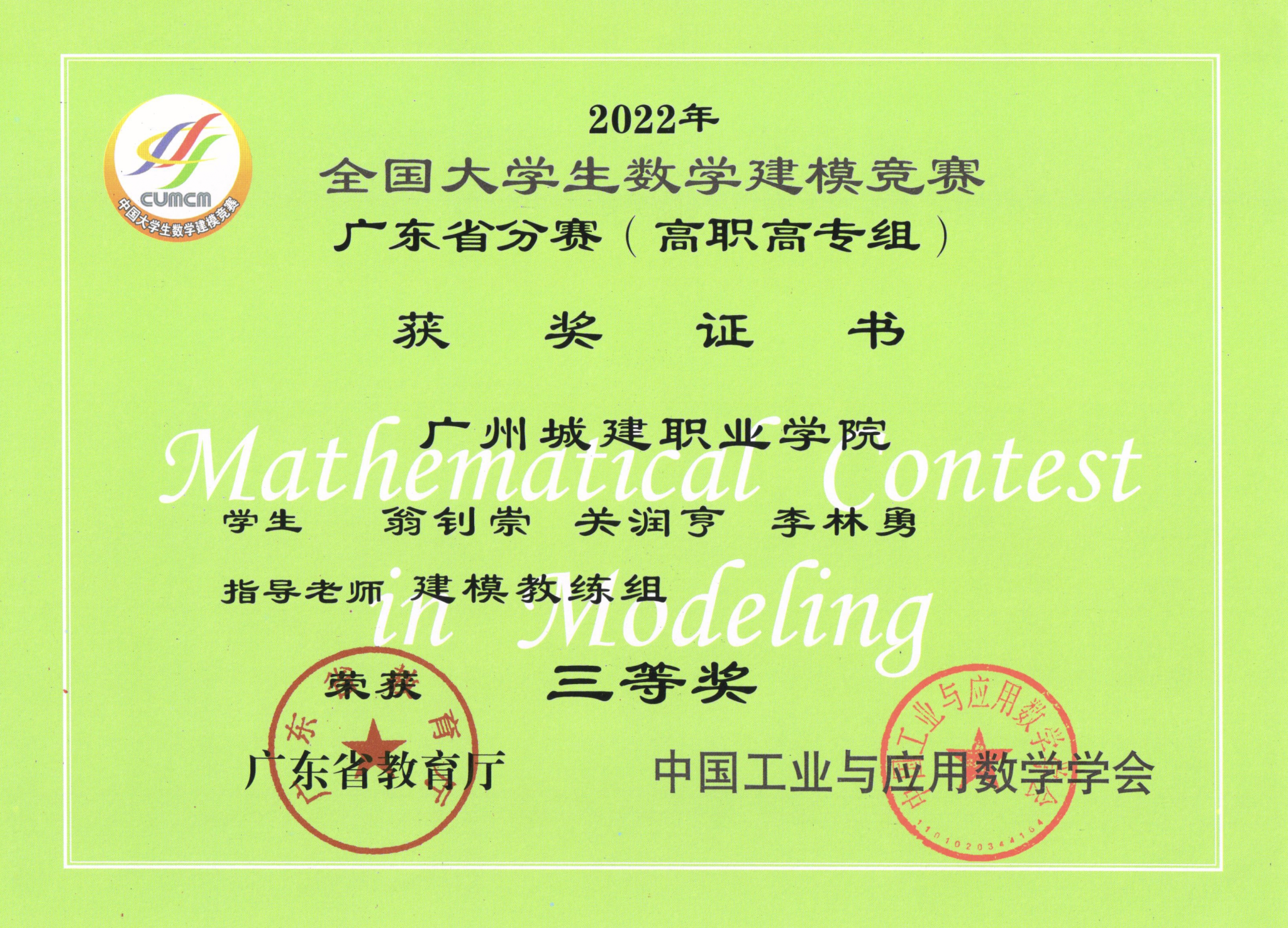 4.2022年9月荣获2022年全国大学生数学建模竟赛广东省分赛(高职高专组)小组三等奖;