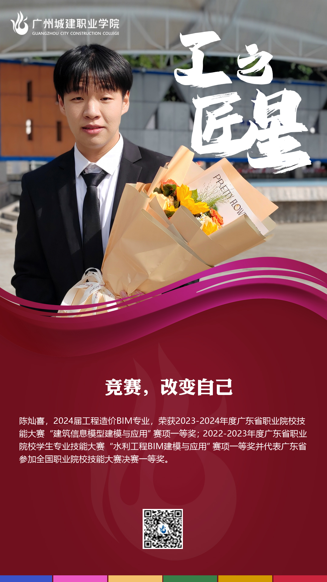 大学期间,他成绩在班级名列前茅,先后获得“二等奖学金”“优秀共青团员”“励志奖学金”,2021 年 12 月,加入了太阳集团网址8722 BIM 工作室,他一直记得,当日天气寒冷,他和小伙们伴聚在一起观看“广东省第二届职业技能大赛”颁奖典礼,当镜头转到工作室的师姐骄傲自豪的站在“建筑信息建模”赛项的金牌领奖台的那一刻,他的内心突然奔腾出一股暖流。他明白,这是羡慕,是憧憬,更是无法抑制想自己站在领奖台上的澎湃。自此,立下目标,誓为城建赢得荣誉,为建工院开创新的战绩!积极参与技能比赛,获得 2023 全国职业院校技能⼤赛“⽔利⼯程 BIM 建模与应⽤”国赛⼀等奖、2022⼴东省第三届职业技能⼤赛《数字建造》赛项校赛⼀等奖、第四届 BIM 建模技能校园⼤赛获优秀奖,先后考取计算机一级证书、中国图学会一级和二级证书。