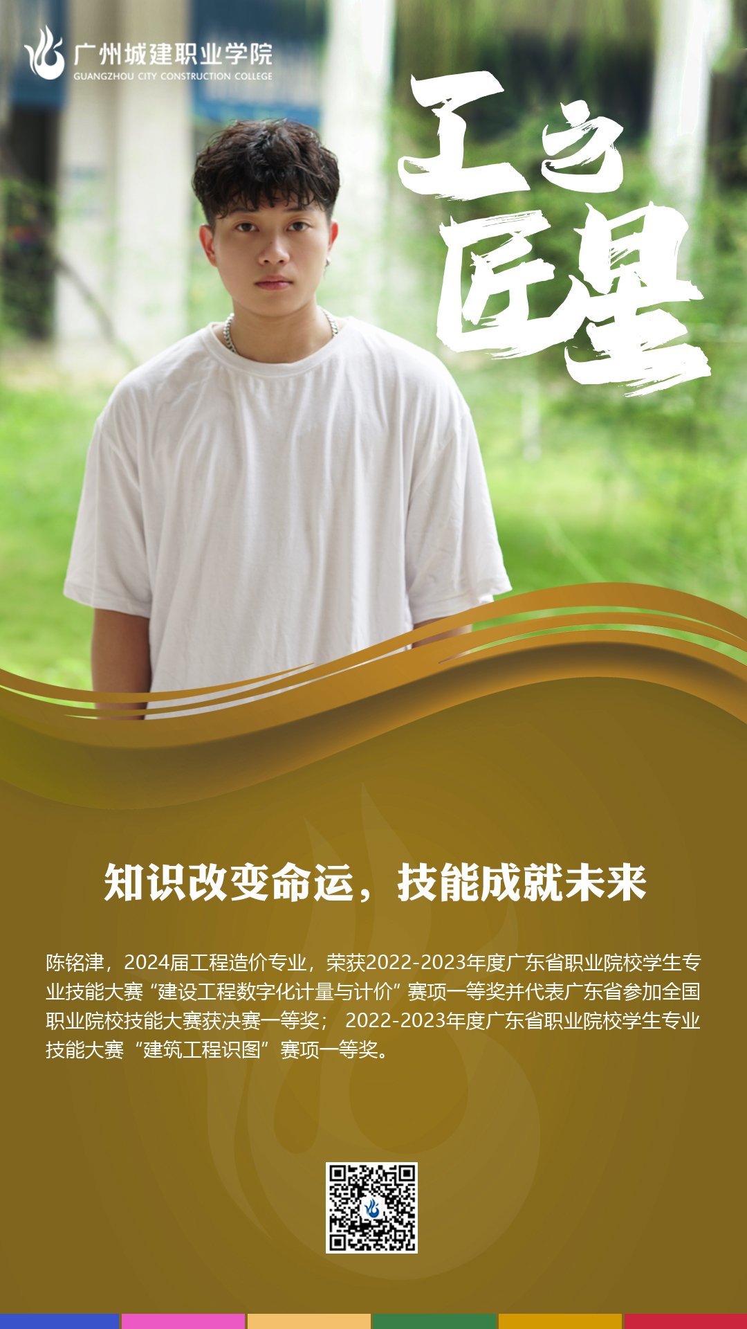 非常幸运荣获2022-2023 年度广东省职业院校学生专业技能大赛"建筑工程识图"赛项一等奖、"建设工程数字化计量与计价"赛项一等奖,代表广东省参加全国职业院校技能大赛获得"建设工程数字化计量与计价"赛项决赛一等奖。