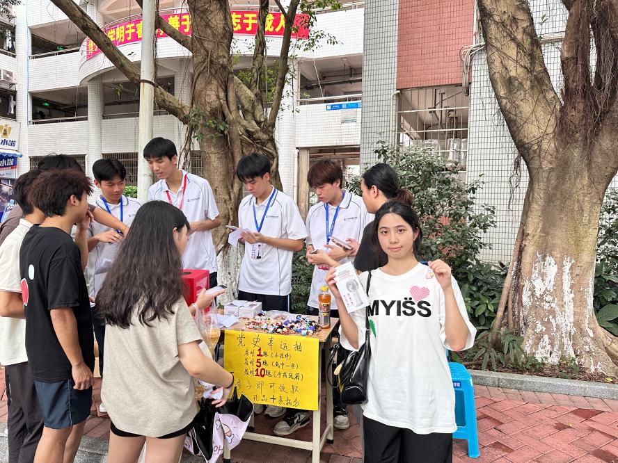 活动现场,大家热情高涨,积极参与。为增添趣味性与挑战性,活动特别采用抽签竞答形式,涵盖了党的发展历程、重大历史事件、重要会议精神,引导学生在答题中深化对党的历史、精神及成就的理解,吸引了众多同学走出宿舍参与到活动中来,强化了学生的爱国情怀与集体意识。