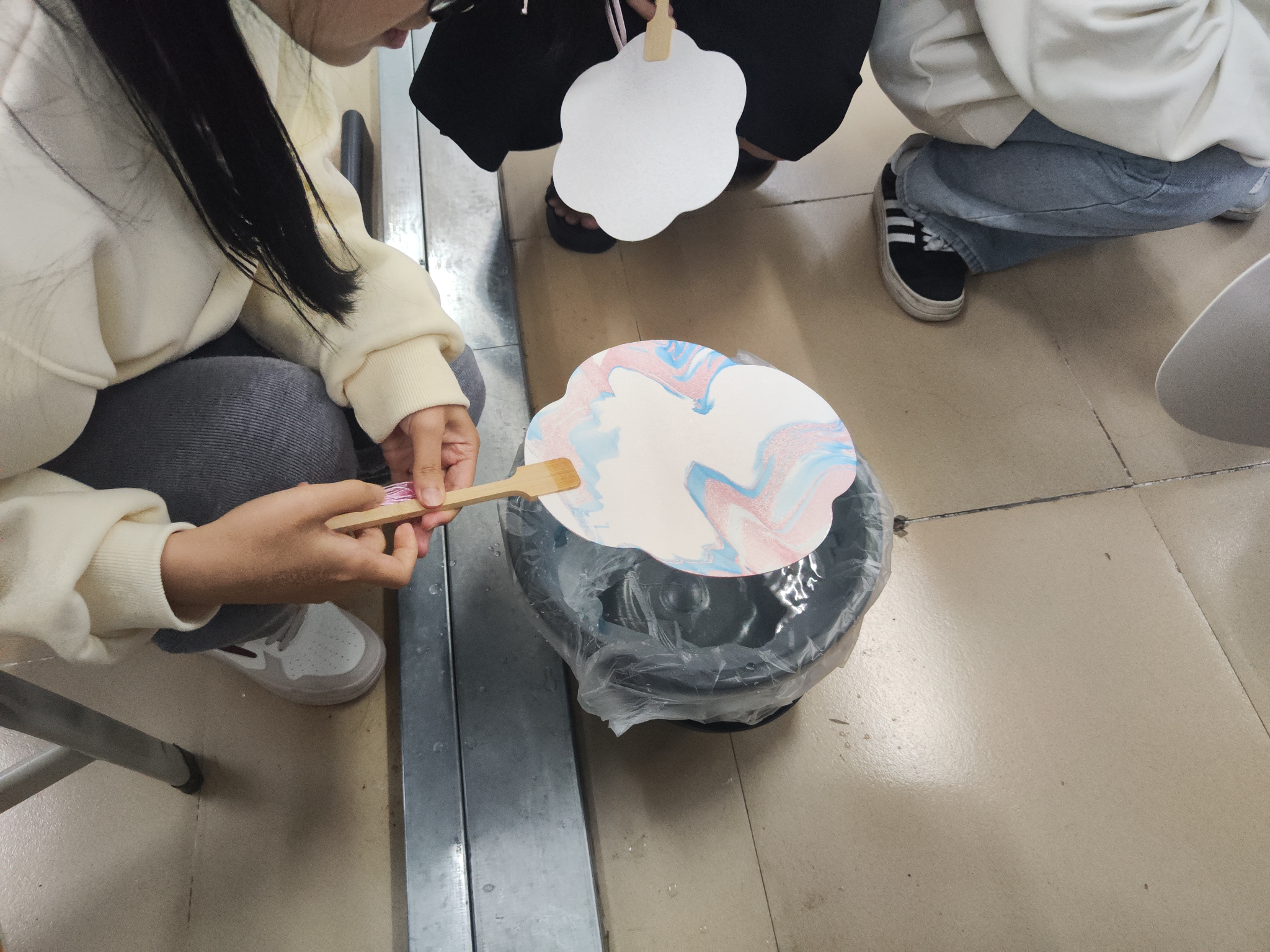 活动伊始,主持人详细介绍了漆扇工艺的历史渊源,扇面材料以及漆扇制作过程。活动中,在工作人员的引导下,参与者每三人一组从选色、调色到上漆、描绘,团结协作制成一把把五彩缤纷且充满祝福的漆扇。制作结束后,由心站工作人员评选出前三把漆扇,获奖的同学上台分享自己制作的寓意。