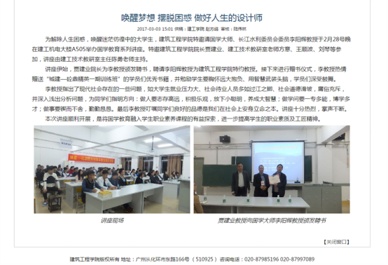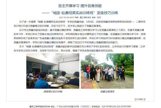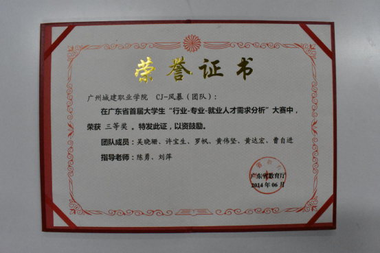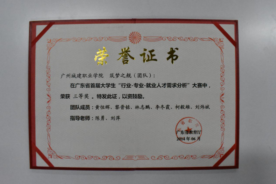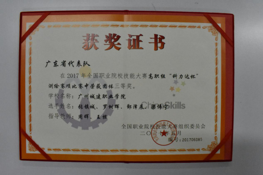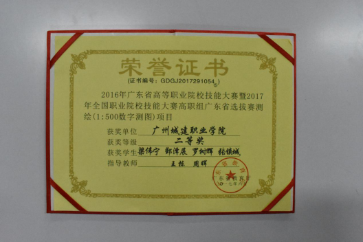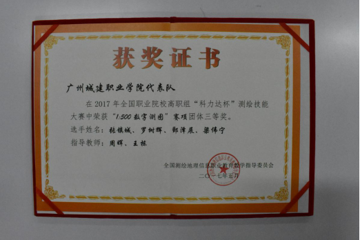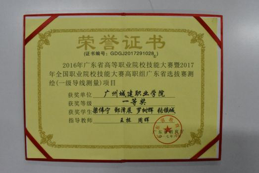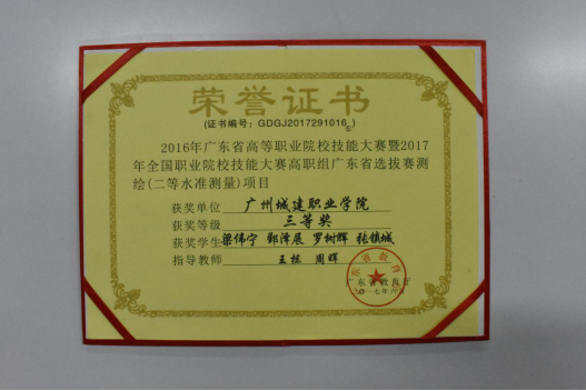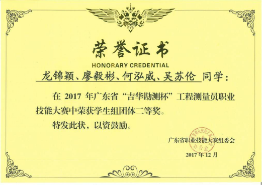 在2017年广东省“吉华勘测杯”工程测量员职业技能大赛中,荣获学生组团体一等奖;