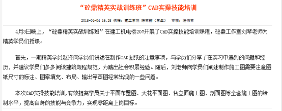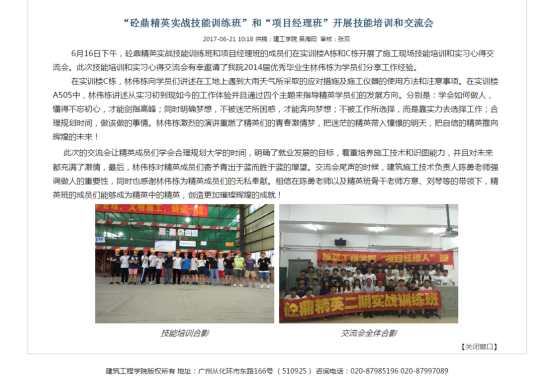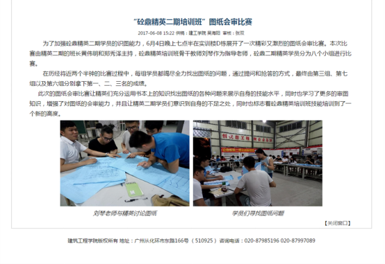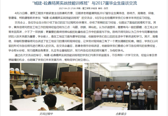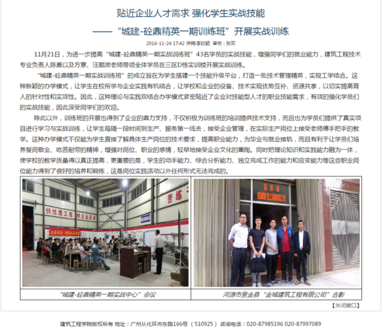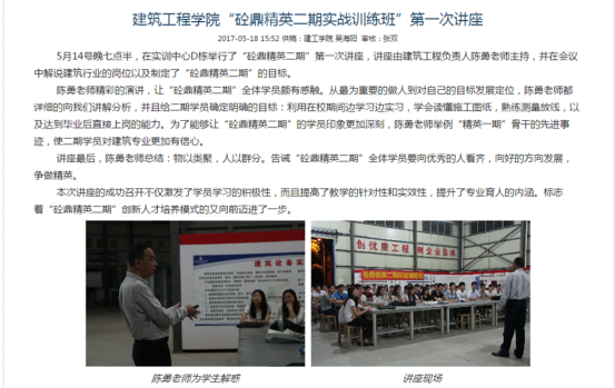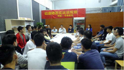 通过中心2016 年暑期对深圳市铁汉生态环境股份有限公司 91 名新员工的岗前培训社会服务活动的企业反馈和新员工的后期跟踪调查,更加肯定中心实战技能培训的理念。2016年 9 月,中心主要老师讨论计划开设砼鼎精英实战技能训练班。计划面向太阳集团网址8722 2015级全体学生中挑选 20 名学生,免费开展实战技能培训。学员经过中心辅导并参与到中心实际工程之中,在毕业时较其他同学能更好的融入到工作之中,独立工作。