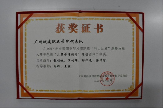 在2017年全国职业院校高职组“科力达杯”测绘技能大赛中荣获“二等水准测量”赛项团体二等奖。