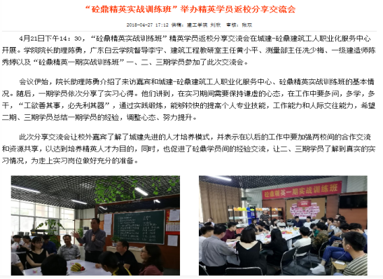 “砼鼎精英实战训练班”精英学员返校分享交流会在城建-砼鼎建筑工人职业化服务中心开展。分享交流会让校外嘉宾了解了城建先进的人才培养模式,并表示在以后的工作中要加强两校间的合作交流和资源共享,以达到培养精英人才为目的,同时,也促进了砼鼎学员间的经验交流,让二、三期学员了解到真实的实习情况,为走上实习岗位做好充分的准备。