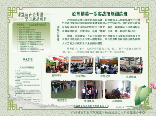 城建-砼鼎精英实战技能训练班由城建-砼鼎建筑工人职业化服务中心开办,通过实战技能培训,培养现代化创新创业全方位实战技能精英人才,以“立竿见影,马上上岗”为目的。在建筑工程技术品牌专业建设、课程建设、师资团队建设、学生实习就业、教师社会服务能力提升等方面都取得了显著成绩。