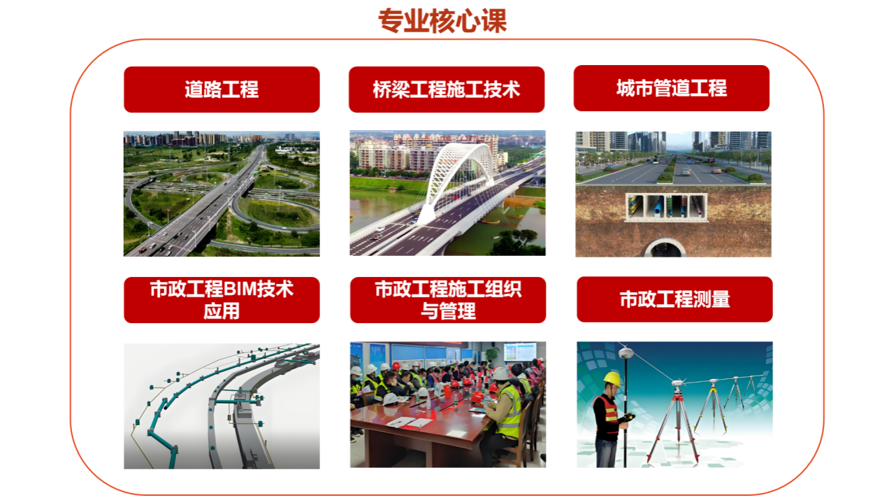 本专业面向城市公共基础设施建设和维护行业,主要包括城市道路桥梁、城市综合管廊、给排水、园林绿化等城市公共事业工程。培养掌握市政工程(道路、桥梁、管道)识图与绘图、BIM建模、施工测量、质量检测、施工组织管理等方面知识和技能的拥有数字化思维的高素质技术技能人才。