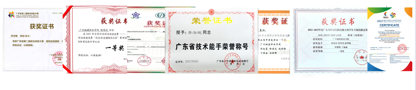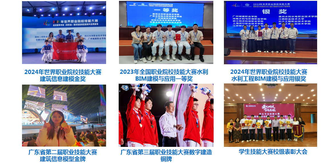 近三年,本专业学生在专业技能等竞赛中硕果累累,获第八届中国国际互联网+大赛银奖1项、2023年全国职业院校技能大赛“水利工程BIM建模与应用”一等奖1项、广东省职业技能大赛BIM赛项冠军、广东省第三届职业院校技能大赛“数字建造”项目铜奖、广东省技术能手等国家级奖项2项,省级奖项30余项。