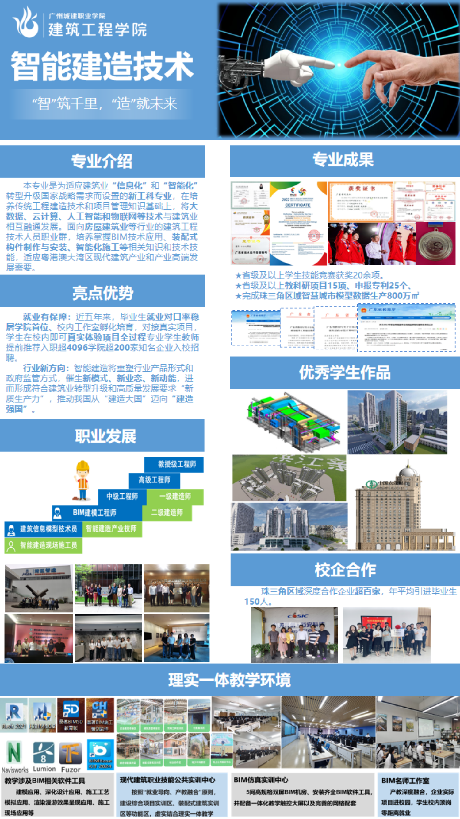 本专业培养掌握BIM技术应用、装配式构件制作与安装、智能化施工等相关知识和技术技能,适应粤港澳大湾区现代建筑产业和产业高端发展需要,从事BIM数据生产应用、建筑工程智能施工技术与管理、智能测绘、建筑机器人产业技师等工作岗位的高素技术技能人才。